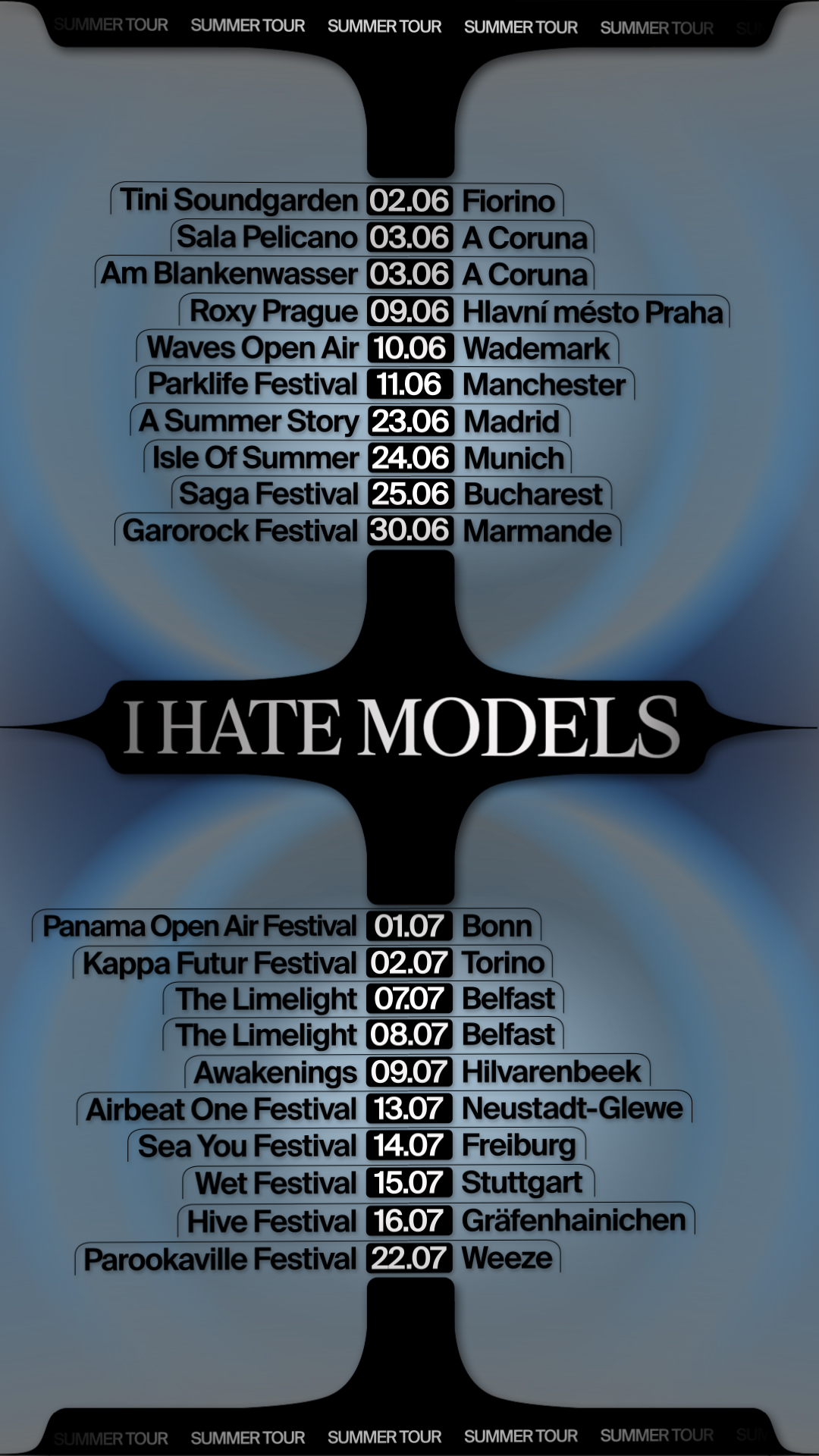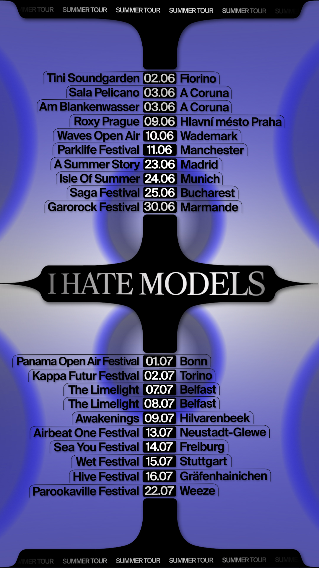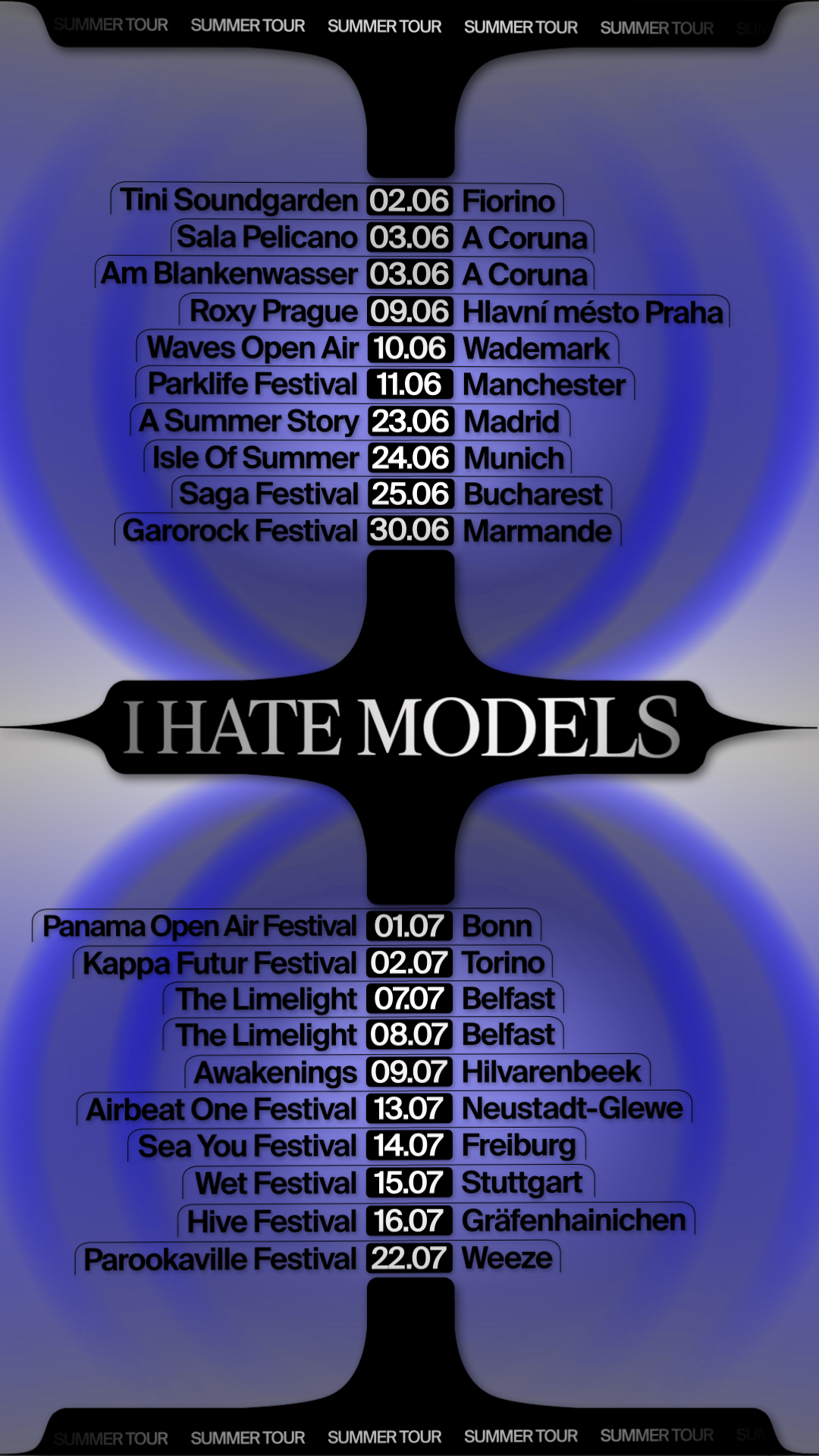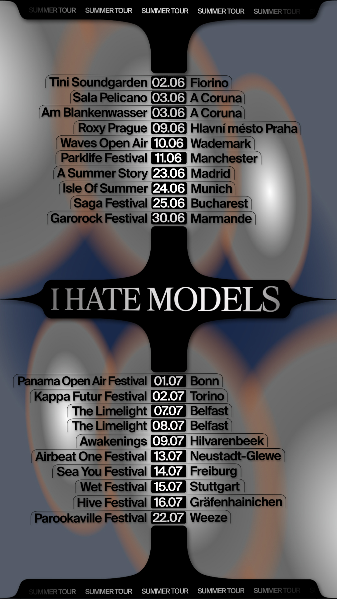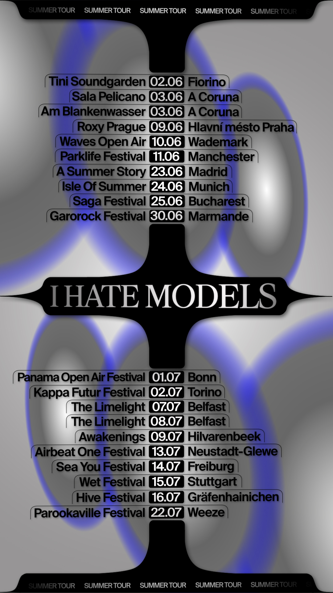 Recherches graphiques pour l'annonce du summer tour 2023 de I HATE MODELS. Système de motion design et déclinaisons d'affiches. Le système offre de très nombreuses combinaisons de couleurs et de formes.